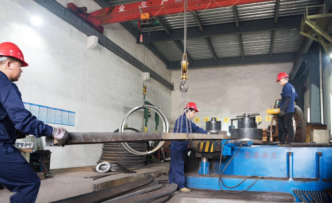 鍛打、車(chē)削為一體的流水生產(chǎn)線(xiàn),公司引進(jìn)優(yōu)質(zhì)卷制法蘭設(shè)備,采用了大